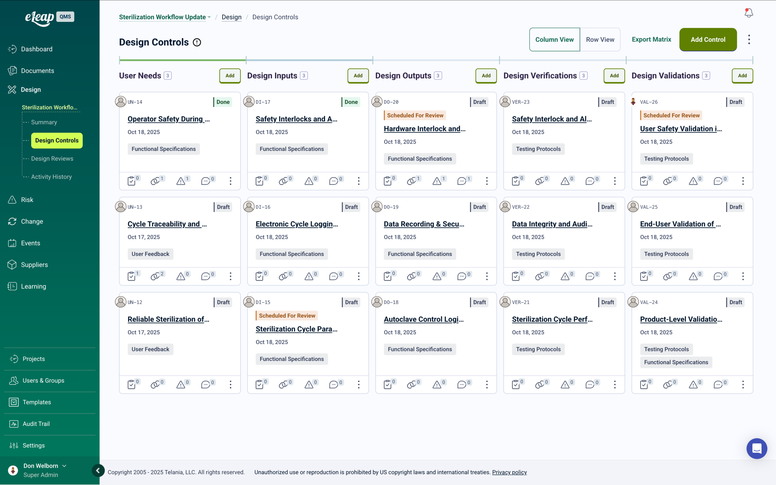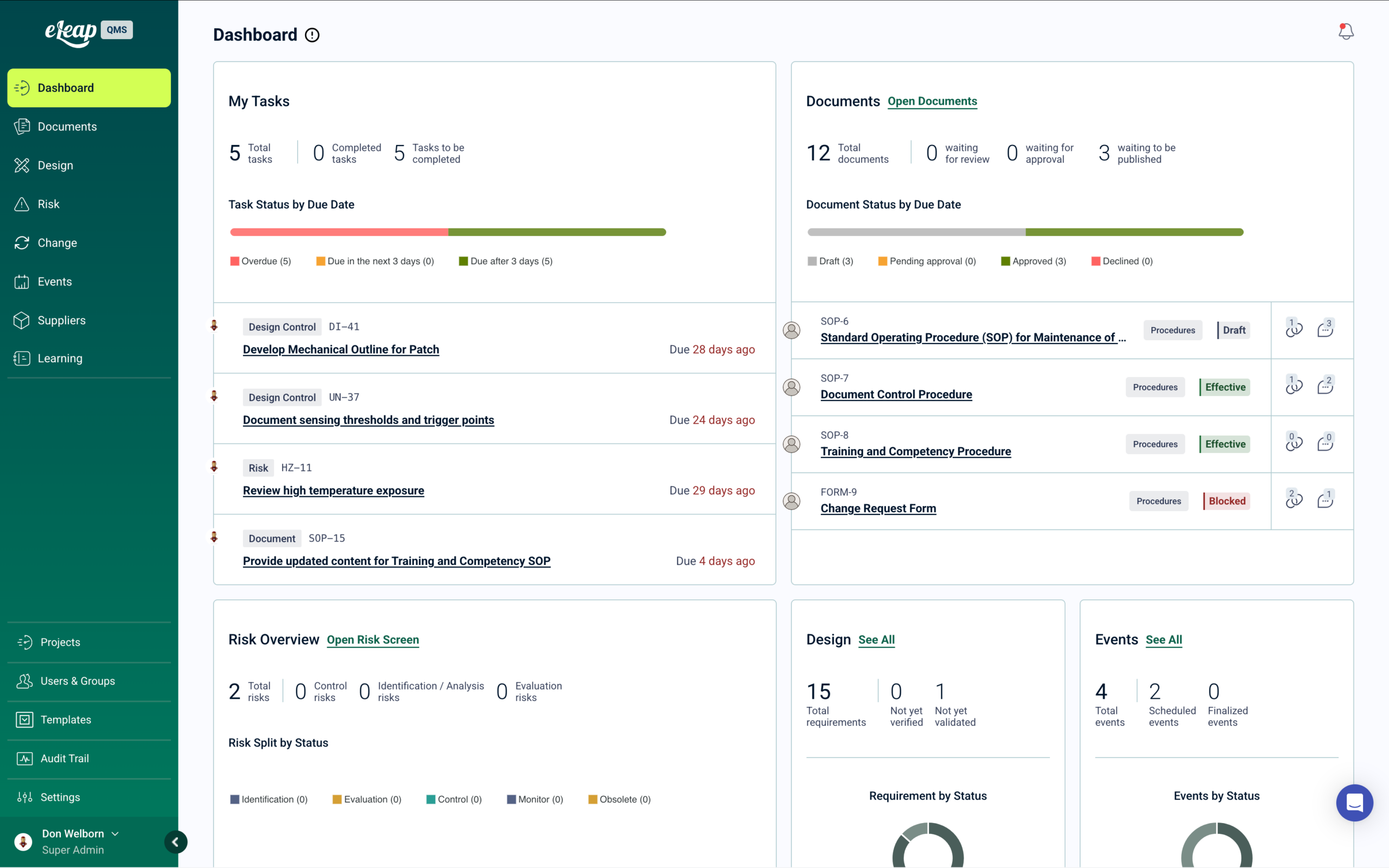 eLeaP delivers a user-friendly QMS with seven core modules covering documents, design, risk, change, quality events, suppliers, and learning. Training is automated to address compliance gaps, convert documents into learning tools, and trigger retraining based on changes, audits, or events, using quick-deploy templates to ensure teams can focus on continuous improvement.