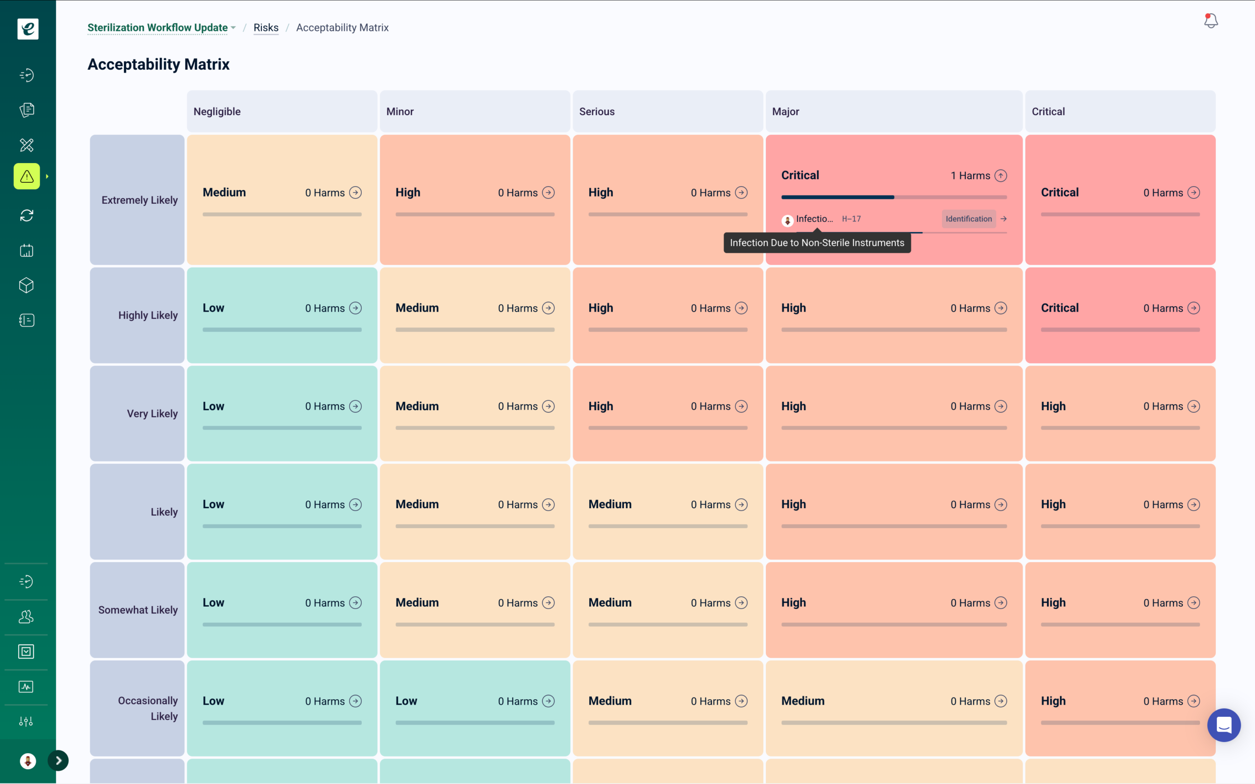 Bridge the gap between risk identification and prevention. eLeaP supports ISO 14971 (MedTech), ICH Q9 (Pharma), and FMEA methodologies in one unified platform. Conduct comprehensive assessments using customizable probability and severity matrices, generate risk priority numbers, and track residual risks in real-time.